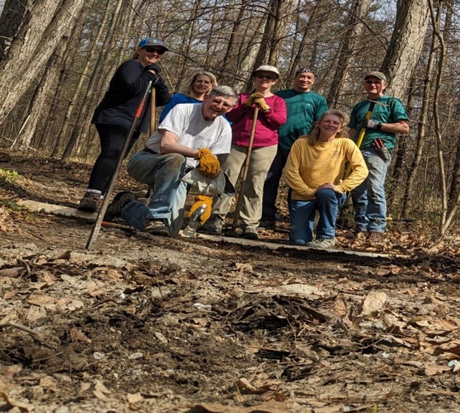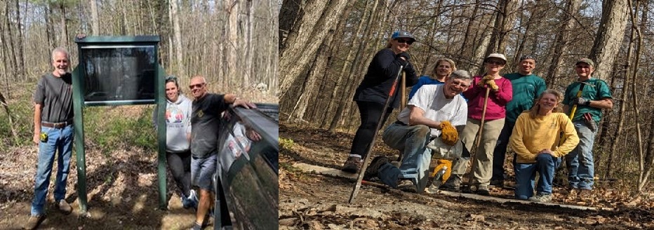 The first photo is of Heather Corbett, John Cormier and Paul Gagnon, who installed a kiosk at the park. In the second photo, in front is, Tim Kenendy, volunteer and professional trail builder, who taught volunteers how to build water bars. Volunteers in the photo include Michelle Cook, Deb Kruzel, Linda Irish Simpson, Rick & Lisa Fregolle and Marc Duquette — they are a testament to the power of teamwork. With two dirt berms, two log water bars, and one rock water bar, now in place, significant strides have been made toward mitigating erosion along the blue trail.