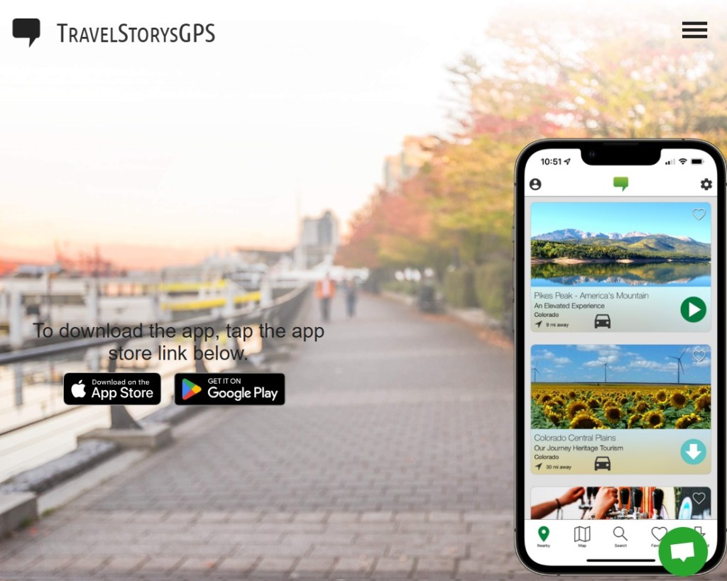 Head over to TravelStorysGPS.com or open the App Store/GooglePlay and search “TravelStorysGPS”