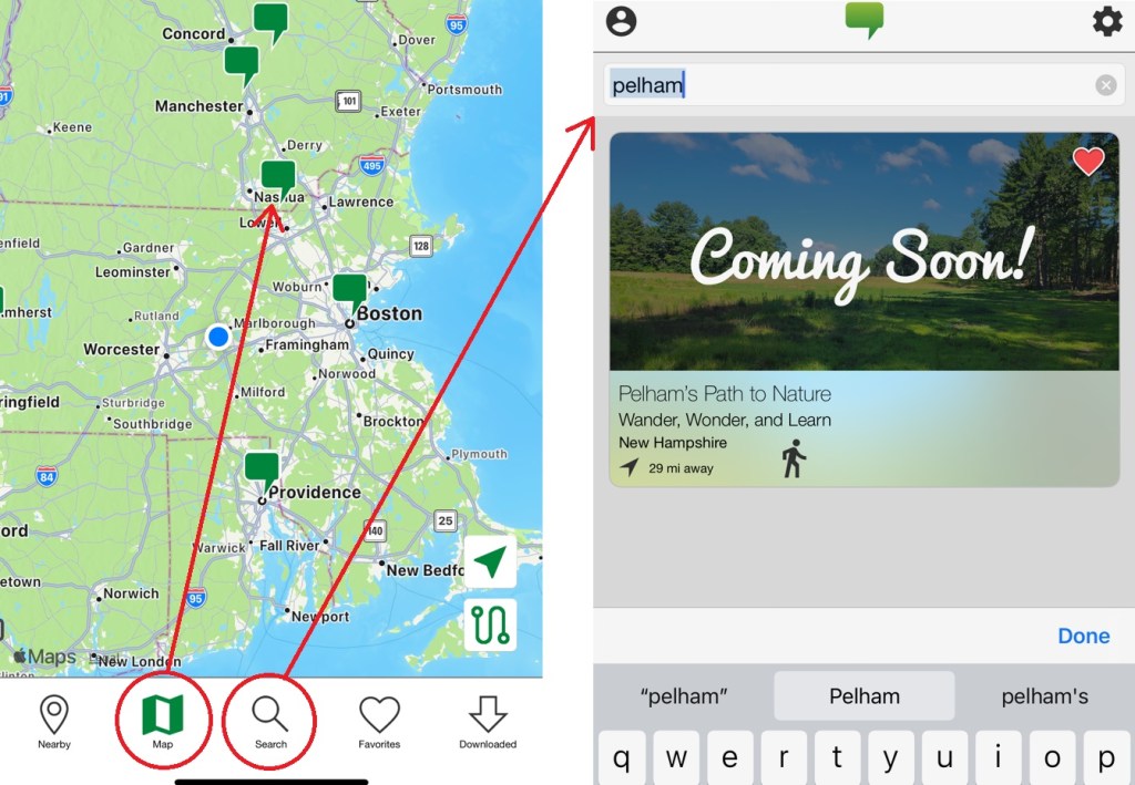 Once you have the TravelStorysGPS app open, you can either click the “Map” and find our location in Pelham NH or click the “Search” and type in “Pelham”. Once you find the tour, click on it to begin.