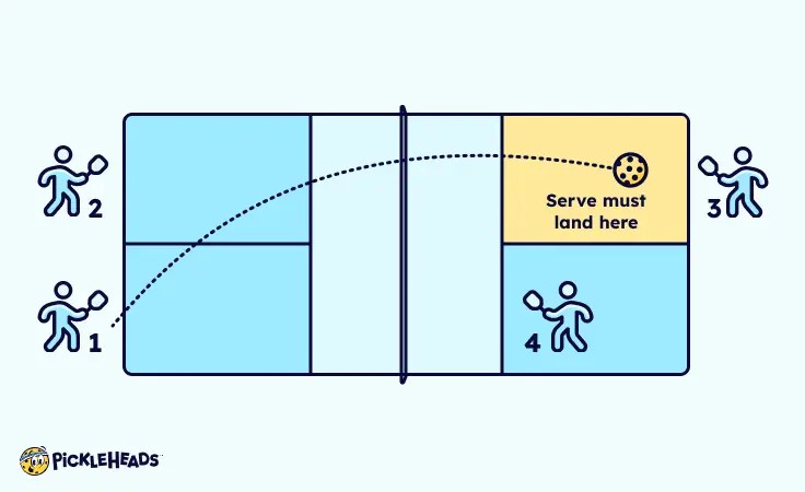 - You serve diagonally across the court and the ball must clear the non-volley zone (also called the “kitchen”).
