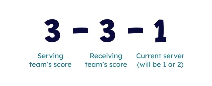 - At the start of each serve, the server announces the score with three numbers: your team’s score, the opponent’s score, and whether you are the first or second server (for example: “3-2-1”).