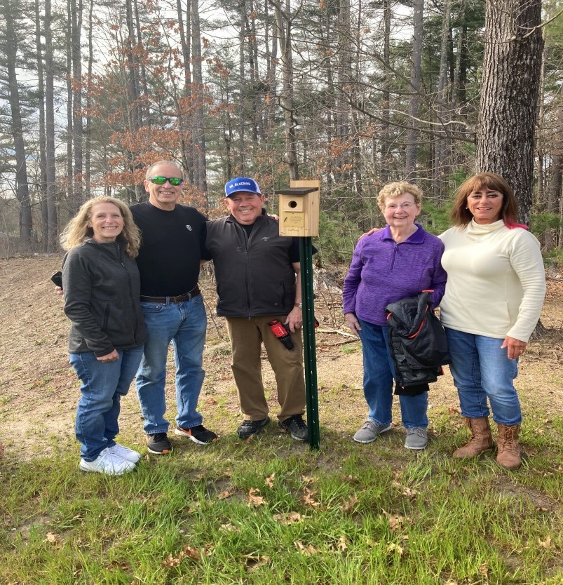 Photo of Lisa & her husband, Rick, with Roger Montbleau, “Chairman of the Bluebird Housing Authority”, Janet Ceasar, COA Celebration Park Committee member and Yvonne La-Garde, Chair of the Pelham Pathways. In the second photo Roger is teaching us how to check on the nesting birds and clean out nests of birds, like the house sparrow. House sparrows are an invasive species from Europe and have done significant damage to populations of native cavity-nesting birds like the Eastern Bluebird.